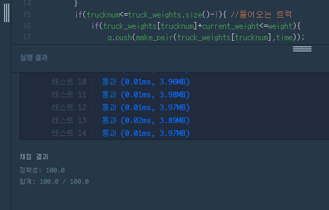 q.push(make_pair(truck_weights[0],1)); //첫 트럭 push