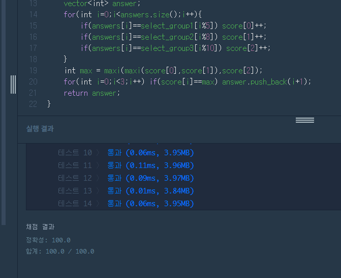 시험은 총 answers.size() 문제가 있고, %(나머지 연산자)를 이용하여 주기 사이클을 돌려가며 답과 비교하면 된다.