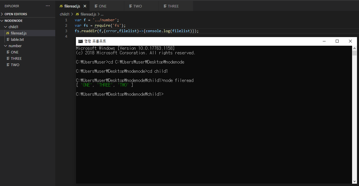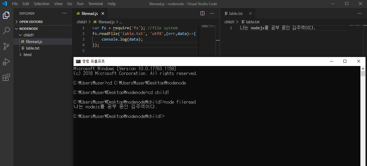 - cd child1로 인해 child1 디렉토리로 이동하였고, fileread.js와 동일 디렉토리에 있는 lable.txt를 인식할 수 있게 되었다.