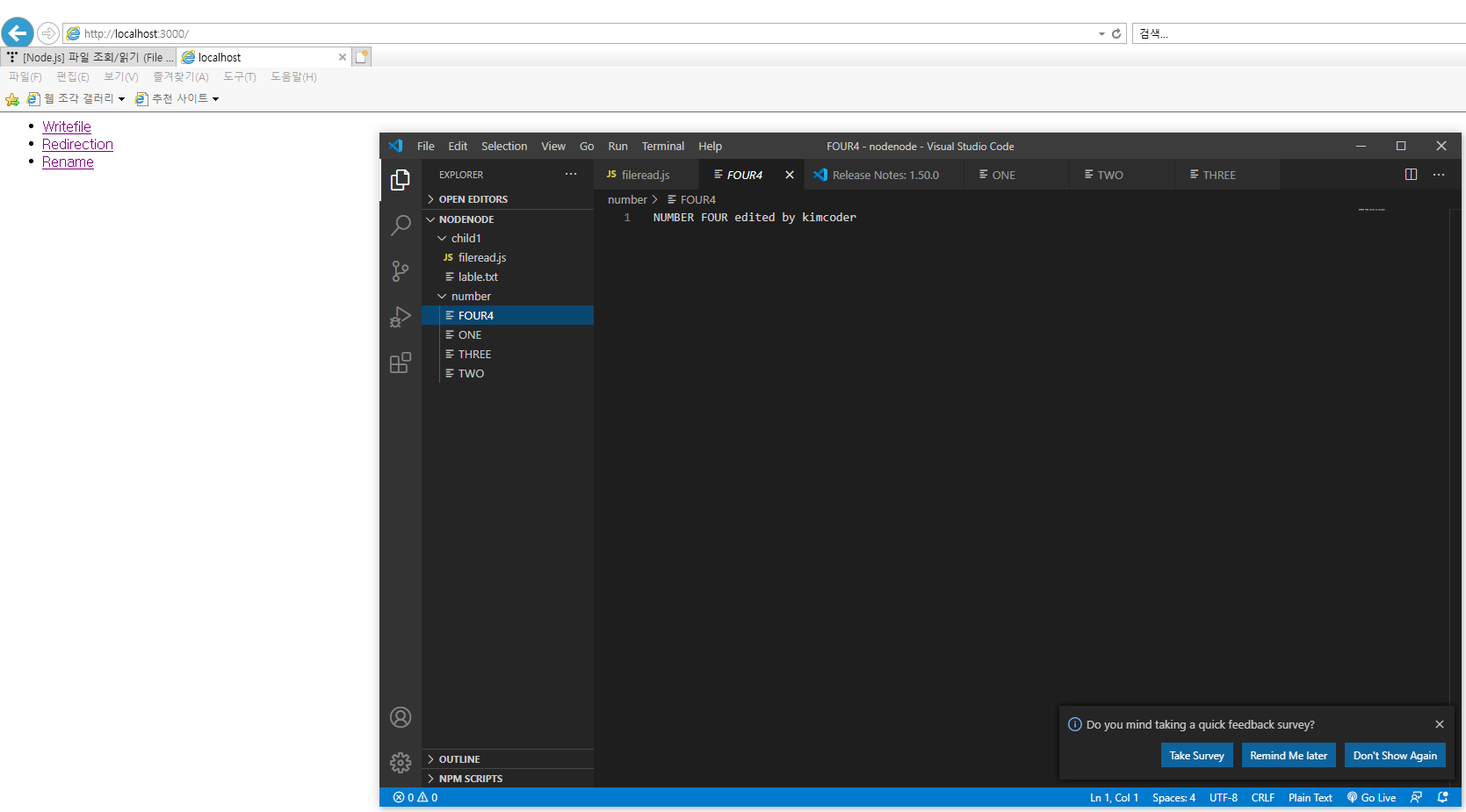 웹사이트에서 rename을 누르면 파일명이 FOUR에서 FOUR4로 바뀌며 내부 내용은 "NUMBER FOUR edited by kimcoder" 으로 변경 된다.