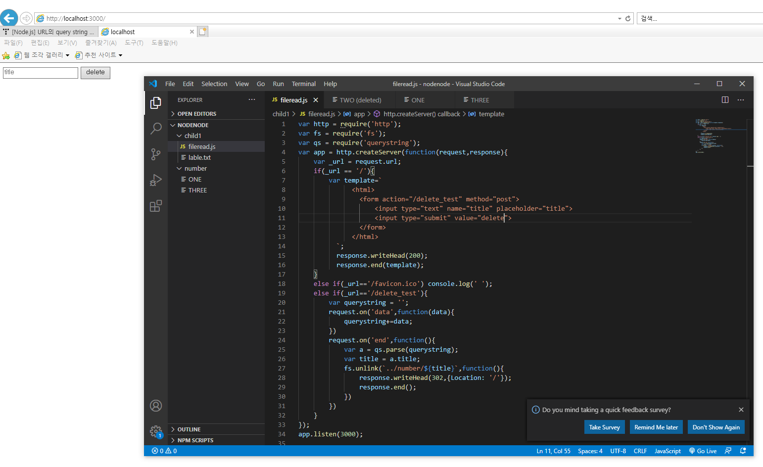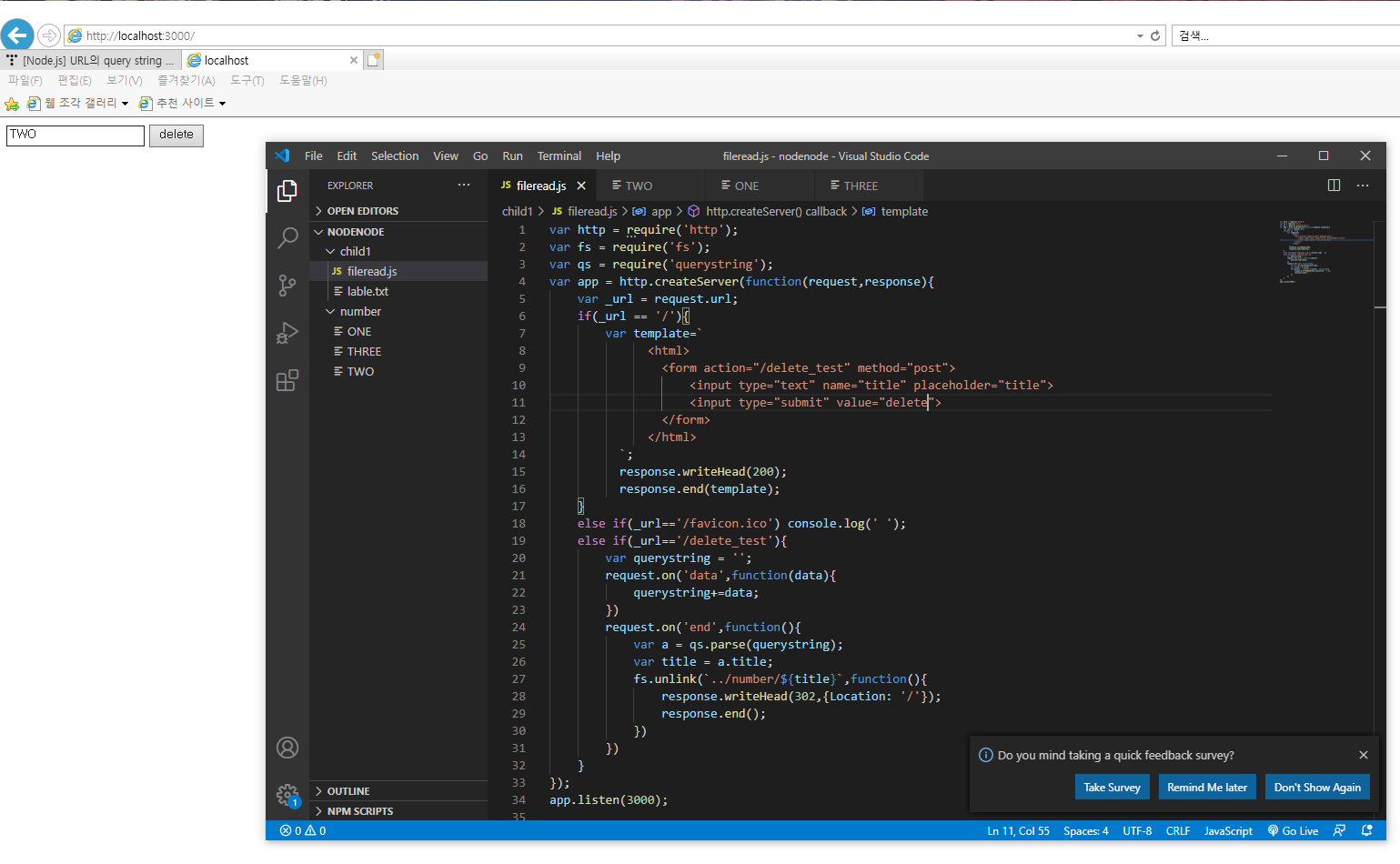로컬 웹페이지에서 title이라고 쓰여있는 텍스트에 삭제하고자 하는 파일명을 입력하고, delete 버튼을 누르면 number디렉토리에 있는 해당 파일이 삭제되는 소스 코드를 작성했다.