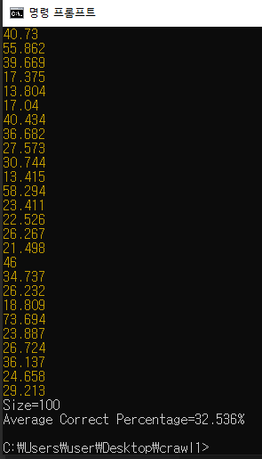 console.log('Average Correct Percentage=' +(sum/size).toFixed(3)+'%');