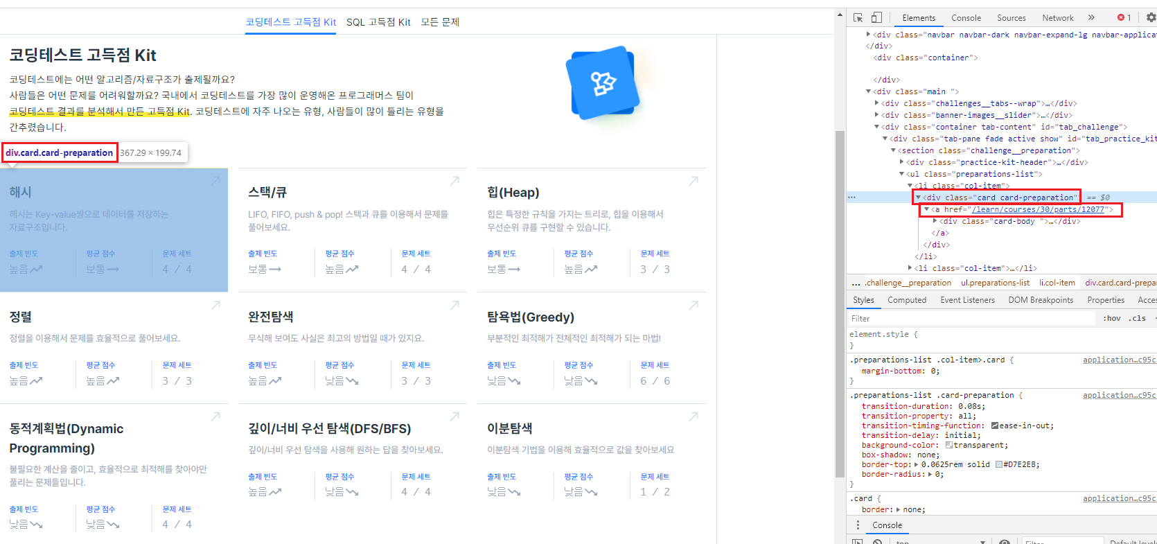 아래 사진을 보면 class가 "card card-preparation"인 <div>태그의 안에 있는 <a> 태그의 href 속성에 카테고리의 링크가 있는 것을 확인할 수 있다.
