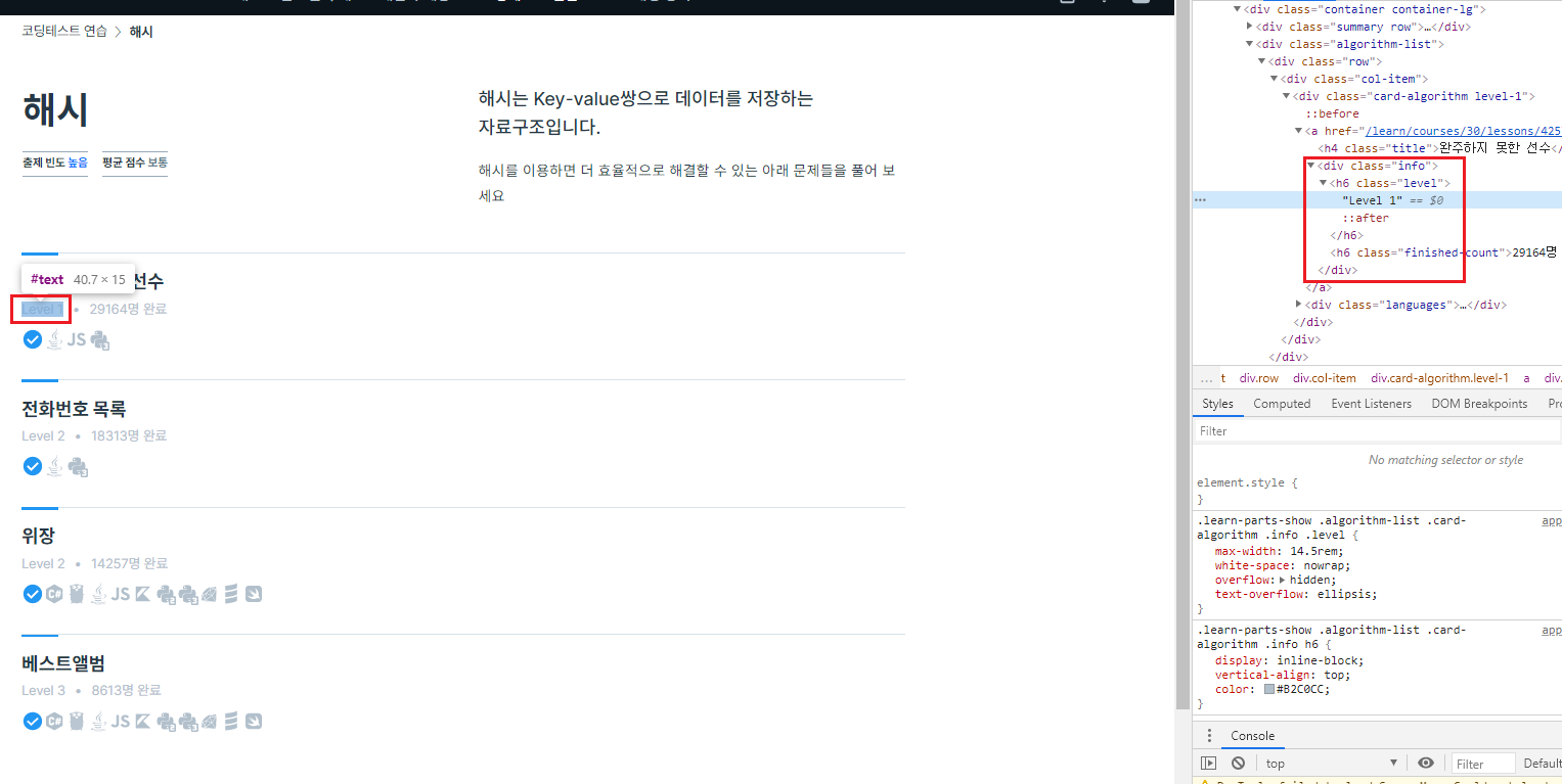 원하는 데이터는 <h6> 태그 안에 "Level x" 라는 형식으로 존재한다.