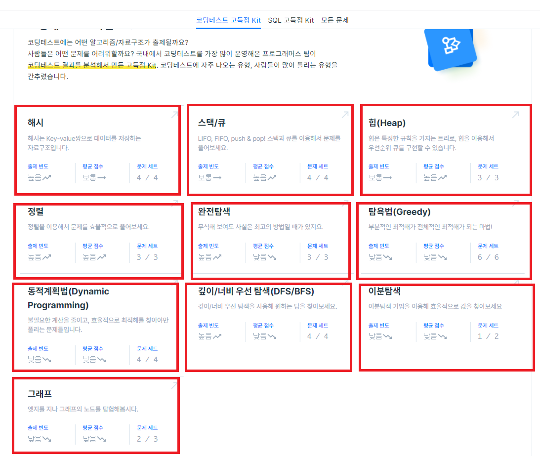 Programmers에서 코딩 테스트 고득점 Kit는 10개의 카테고리 안에 총 36문제로 구성되어 있고,
