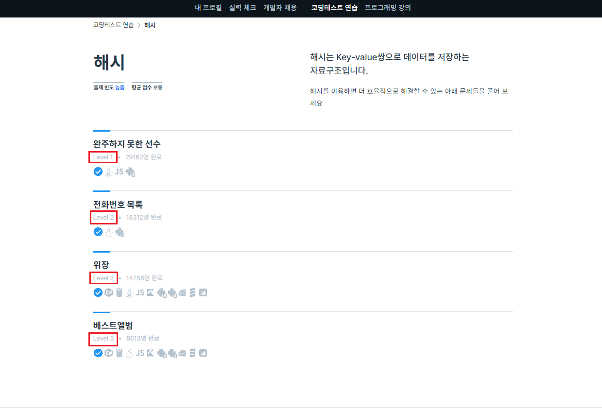 코딩 테스트 고득점 Kit 문제들은 주로 2~3레벨에 분포되어 있고,