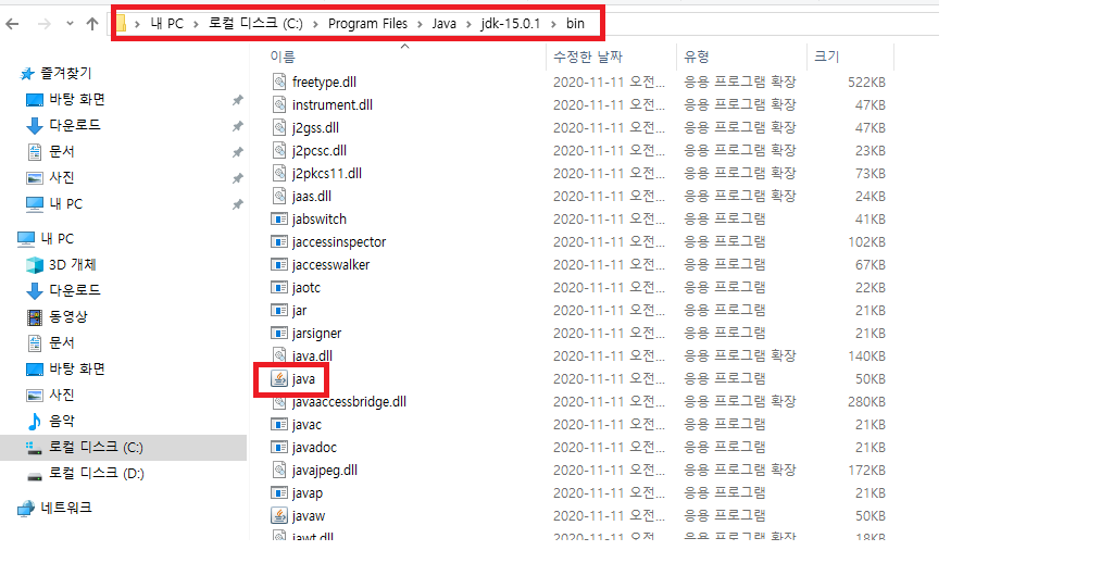 따로 JDK 설치 경로를 설정 하지 않았다면 이 경로에 java가 설치 되어 있을 것이다.