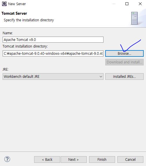 Browse를 눌러 톰캣이 설치된 경로를 지정해주면 되는데,