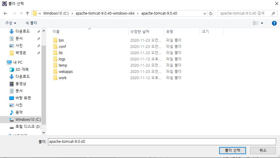톰캣을 설치한 폴더로 경로를 지정해주면 된다.