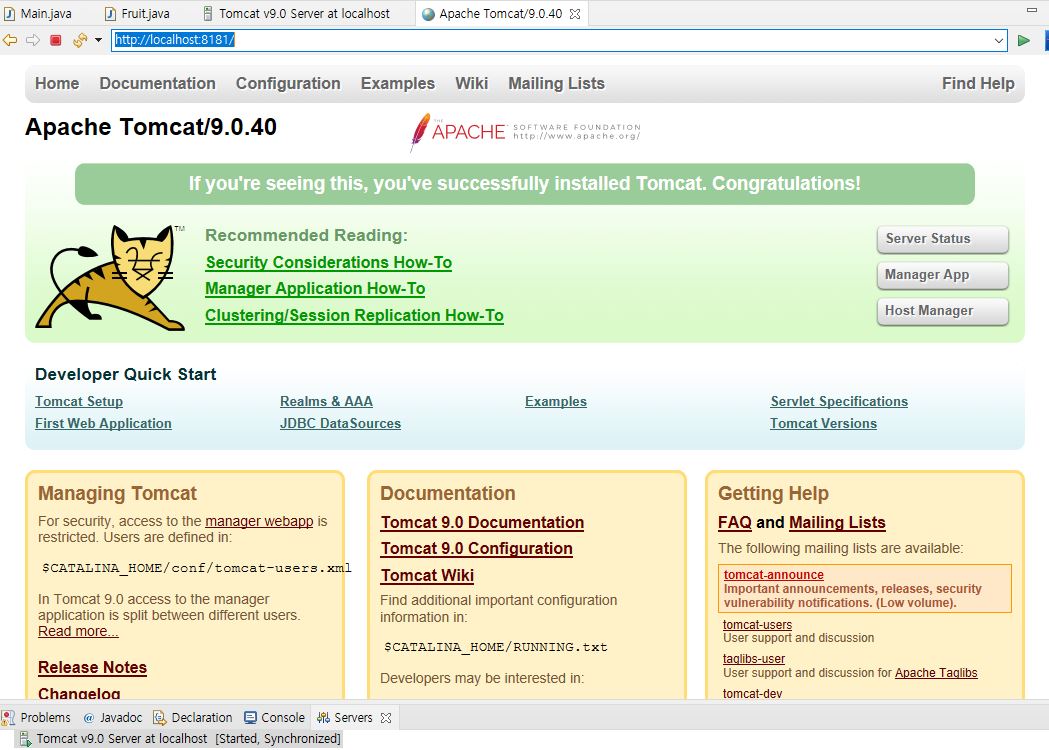 주소창에 http://localhost:8181를 입력하면 웹 톰캣 서버의 메인 페이지가 나온다.