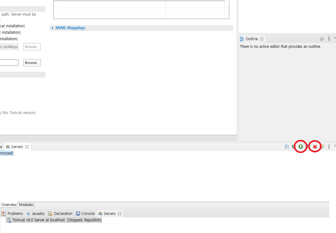 두 개의 빨간 동그라미로 표시한 부분은 서버를 각각 구동/중지 해주는 버튼이다.