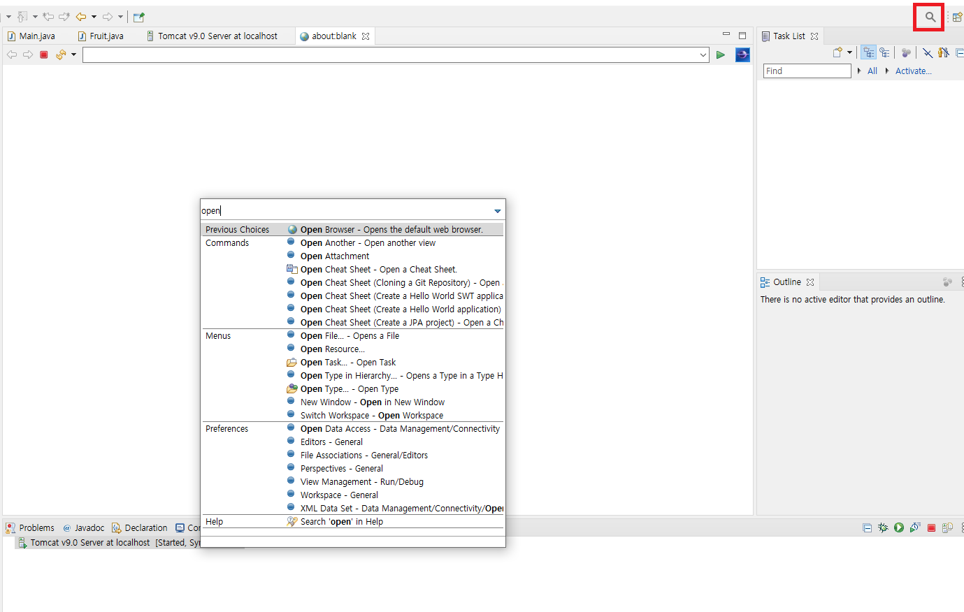 위 도구에 Open Brower가 없다면 우측 위에 돋보기 아이콘을 클릭하고 검색하면 된다.