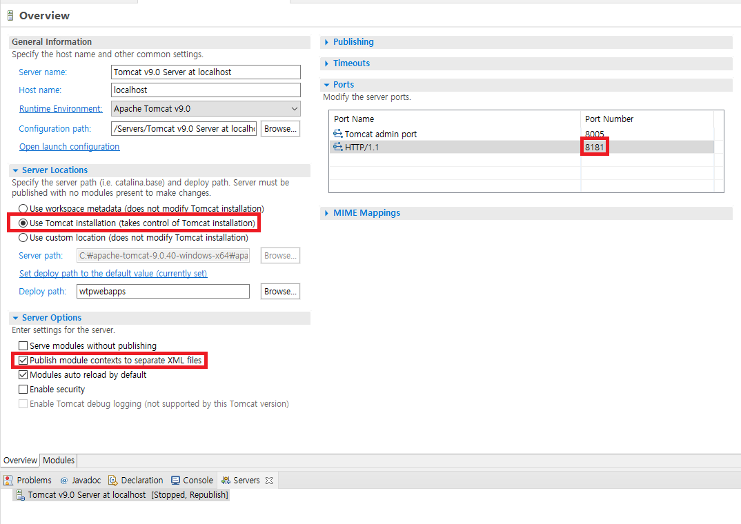 환경 설정하고자 하는 톰캣 서버를 더블 클릭하면 설정 창이 뜬다.