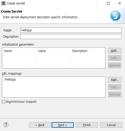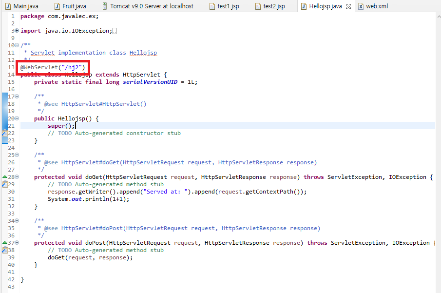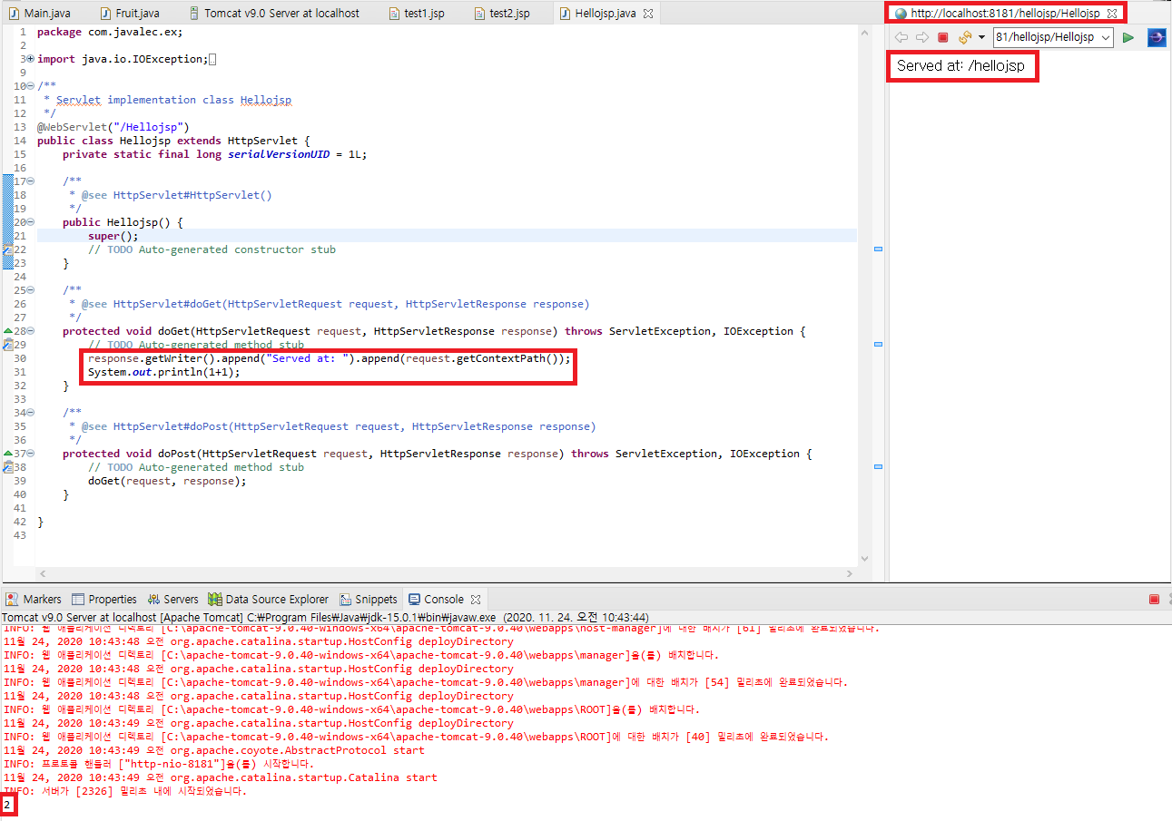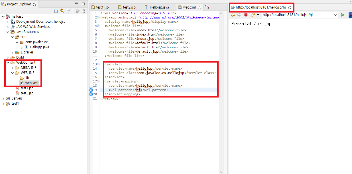 또, 짚고 넘어가야 하는게 있는데 http://localhost:8181/hellojsp/Hellojsp 에서 Hellojsp은 1 - 4) 에서 언급했듯이, URL mappings 에서 지정한 이름이 내부적으로 적용된 것이다. 본인은 따로 특별히 매핑을 하지 않고 그냥 클래스명과 동일하게 했기 때문에 외부적으론 구별이 불가능하지만, 내부적으로는 Name이 아닌 URL mappings의 것으로 접근된 것임을 알고 넘어가자. 참고로, 13줄에 있는 어노테이션에서도 URL mappings의 것이 적용된다.