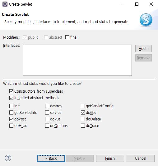 서블릿 파일을 생성할 때 메소드 생성 체크 박스 목록에 doGet, doPost 가 있다.