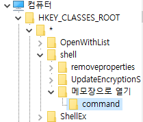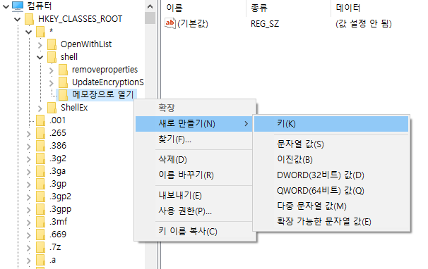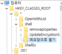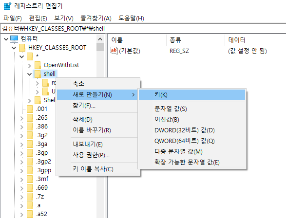 HKEY_CLASSES_ROOT/*/shell 에서 shell을 우클릭한 뒤, 새로만들기 -> 키(K) 를 눌러서