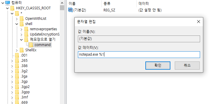 그리고 command 에서 우측에 "(기본값)" 을 더블클릭 하여 값 데이터에 notepad.exe %1을 작성해주고 확인을 눌러준다.