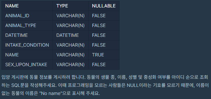 테이블 명은 ANIMAL_INS 이며, ANIMAL_ID 순으로 ANIMAL_TYPE, NAME, SEX_UPON_INTAKE 을 조회하는 SQL문을 작성하면 된다. NAME은 NULLABLE이 TRUE이기 때문에 NULL값이 올 수도 있는데, 이 때의 NULL값은 "No name" 문자열로 대체하면 된다.