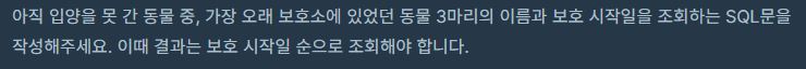 이 테이블에서 보호소에 있었던 기간은 보호소에 일찍 들어온 동물일 수록 더 길 것이다. 이 조건을 상위 3개의 레코드까지 적용하여, 문제가 원하는 정보인 NAME, DATETIME 값을 레코드마다 추출하여 반환해주면 된다.