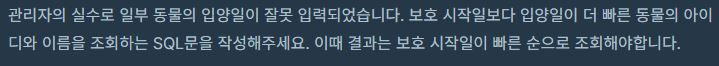 해설 : ANIMAL_INS와 ANIMAL_OUTS 테이블을 ANIMAL_ID에 대해 JOIN해주면 한 동물이 보호소에 들어왔을 때와 입양 갔을 때의 정보를 한 레코드에 확인할 수 있게 된다. ANIMAL_INS, ANIMAL_OUTS의 DATETIME은 각각 보호 시작일과 입양일을 의미하기 때문에 ANIMAL_OUT의 DATETIMEANIMAL_INS의 DATETIME보다 더 작은 레코드들을 찾으면 된다. 문제가 원하는 정보인 ANIMAL_ID, NAME 값을 레코드마다 추출하여 반환해주면 된다.