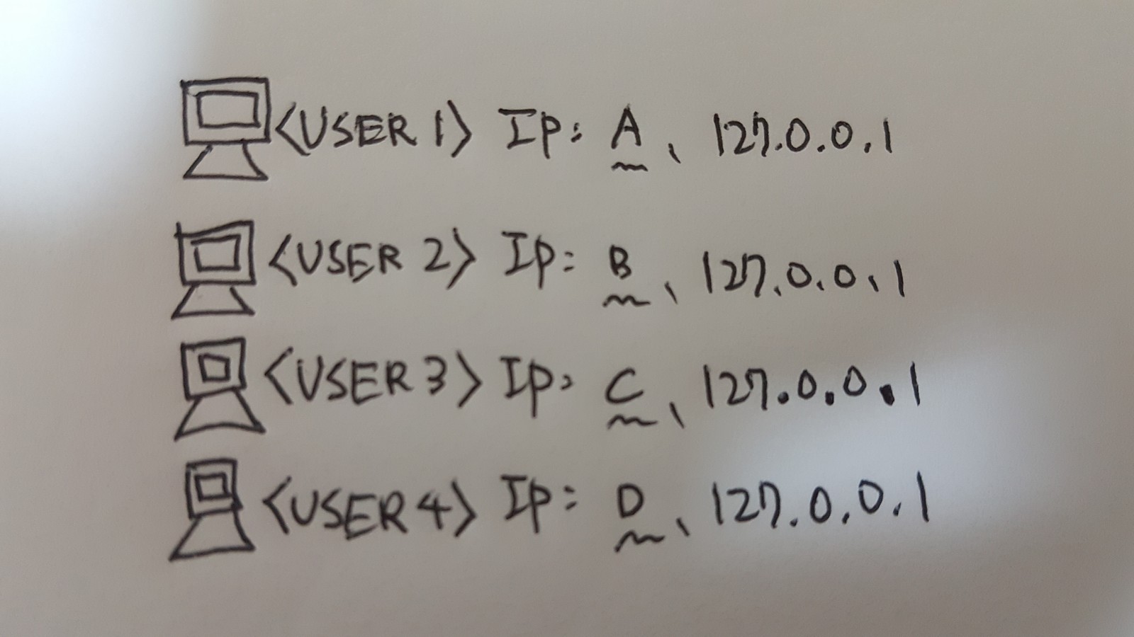 아래 사진처럼 USER 마다 각자 IP주소 A,B,C,D가 있을텐데 이 유저들 개개인의 컴퓨터IP를 127.0.0.1로도 표기할 수 있다.