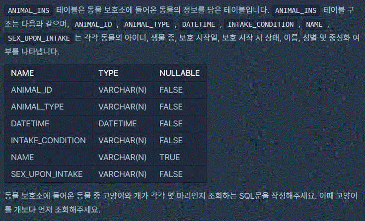 테이블을 보면 동물 종류는 개(Dog), 고양이(Cat) 밖에 없어서 WHERE 문은 쓰지 않아도 된다.