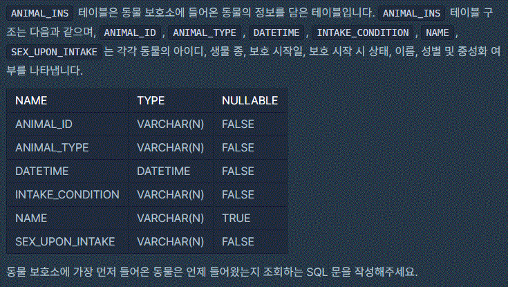 해설 : 테이블 "ANIMAL_INS" 의 DATETIME은 보호소에 들어온 시각이기 때문에, 보호소에 가장 먼저 들어온 동물이 보호소에 들어온 시각은 DATETIME의 최솟값으로 알 수 있는 것이다. 이 값을 조회하면 된다.