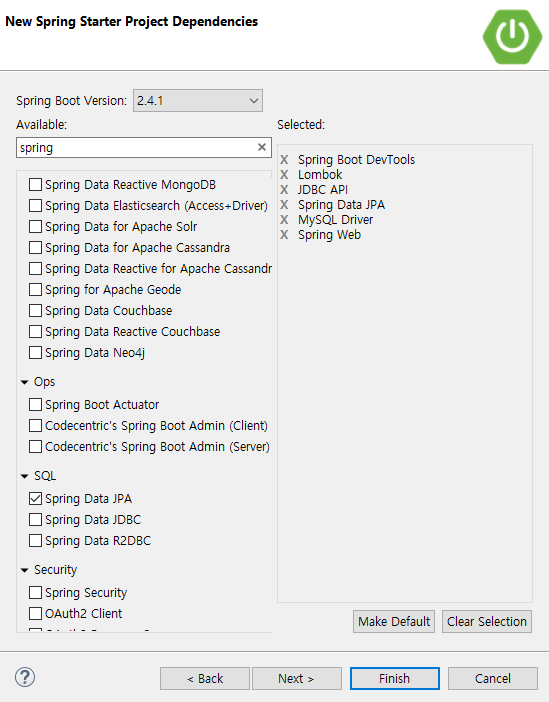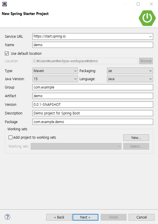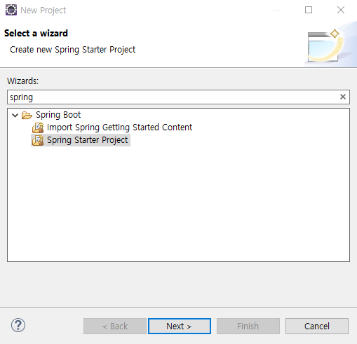 File -> New -> Project 에서 spring을 검색하면 "Spring Starter Project" 가 나올 것이다.