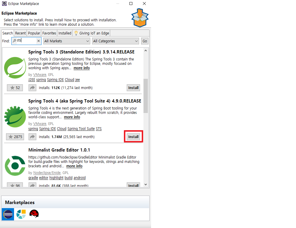 Eclipse의 상단 메뉴 Help -> Eclipse Marketplace로 마켓 플레이스에 들어가서 STS라고 검색하면 Spring Tool Suite이 검색되는데 이를 설치하자.