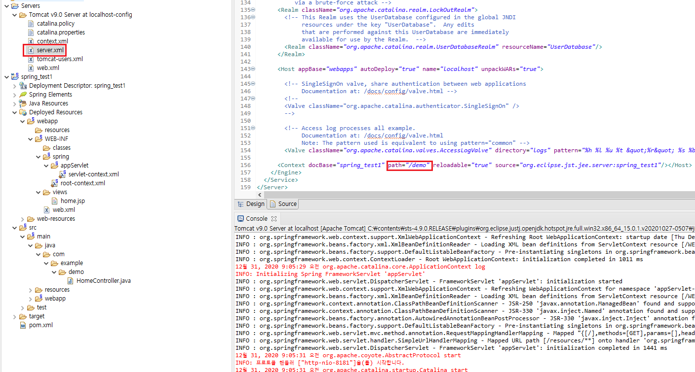 이 /demo는 Context path라고 하고, tomcat 폴더의 server.xml 파일에서 확인할 수 있다.