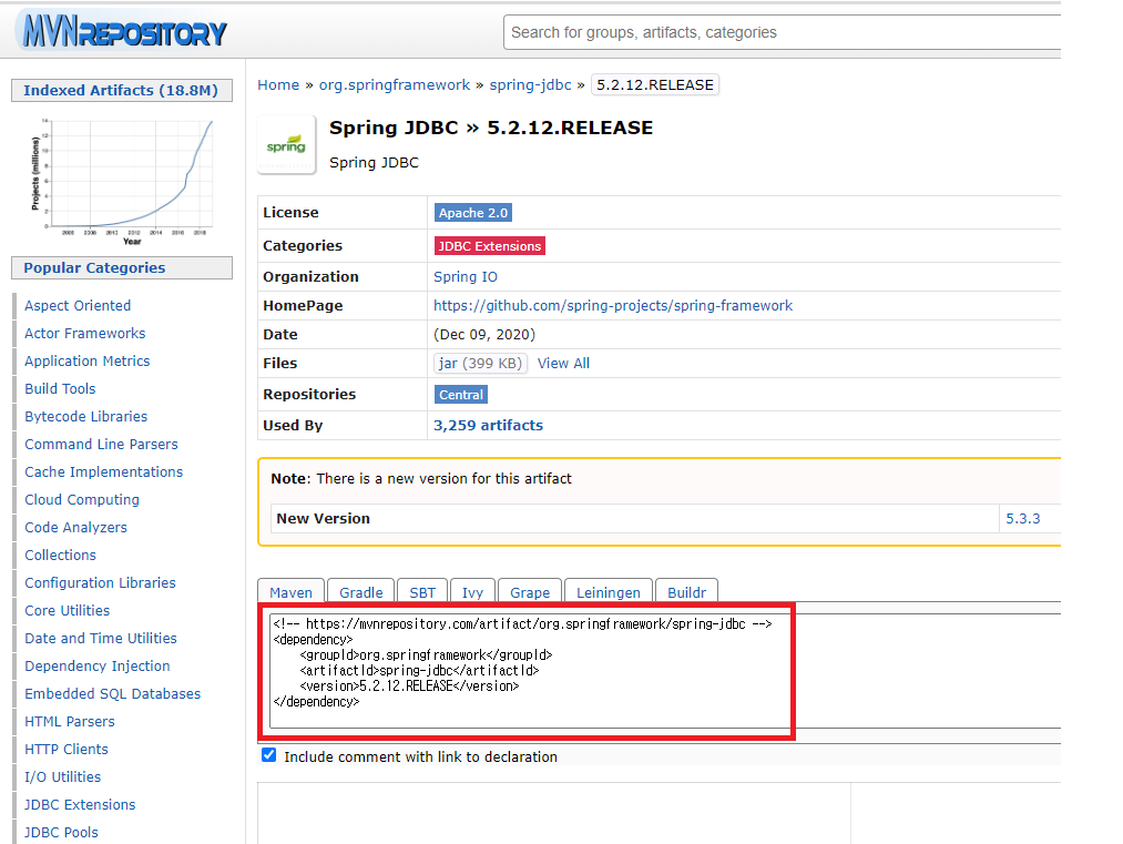 그리고 원하는 버전을 클릭하면 pom.xml에 추가할 dependency 코드까지 알려준다.