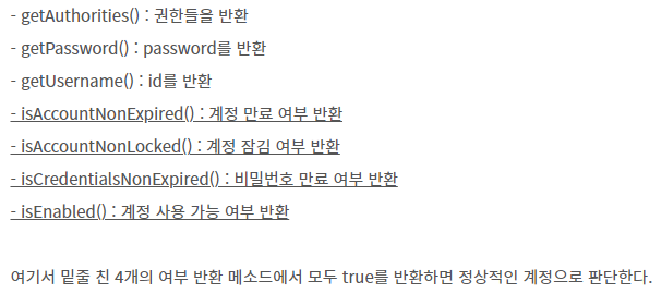 이전 포스팅에서 UserDetails 인터페이스를 상속받은 객체가 override 해야 하는 7개의 메소드를 소개했는데 (사진첨부)