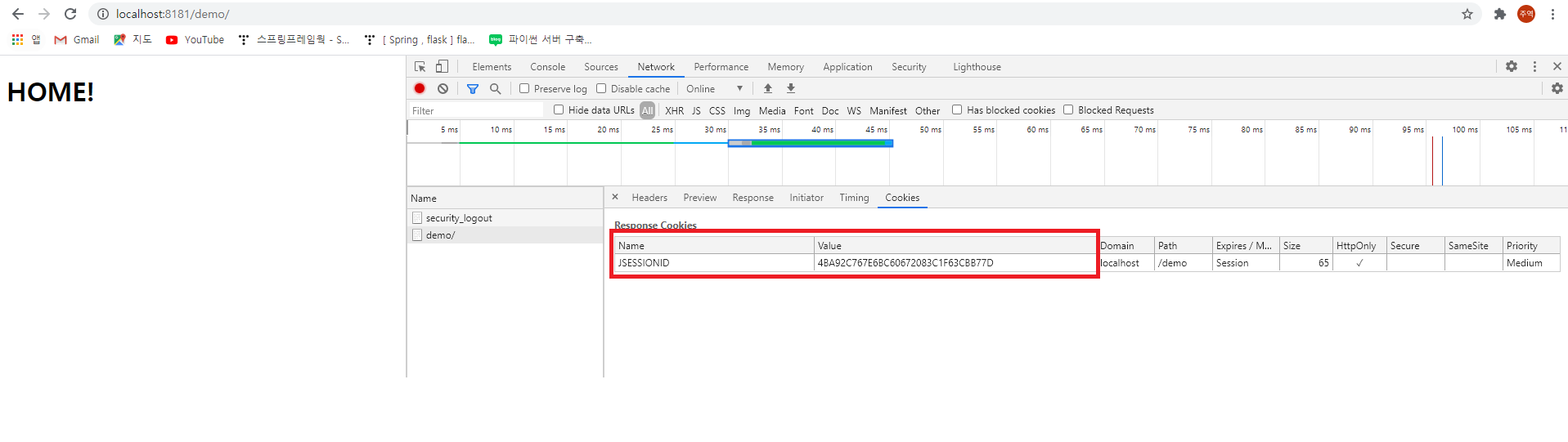 JSESSIONID 쿠키는 기본적으로 있는 쿠키이며, 로그아웃하여 JSESSIONID 쿠키를 삭제하면 다른 value값을 가진 새 JSESSIONID 쿠키가 자동으로 생성된다.