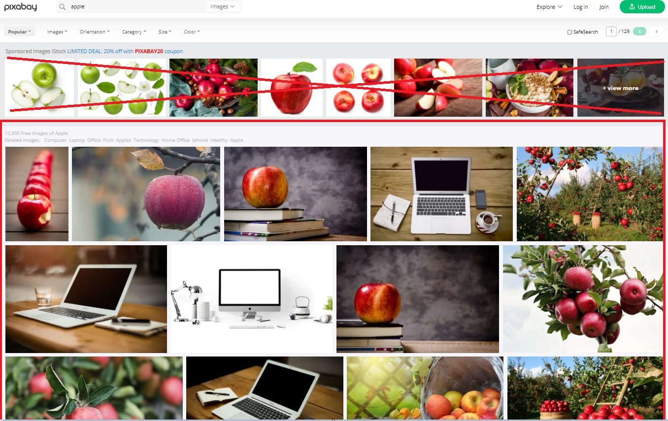 필자가 위에 빨갛게 x로 그어놓은 영역에 해당하는 사진들은 저작권이 있는 이미지들이며, 이런 이미지를 사용하려면 몇 달러를 내야 한다. 그 아래가 free images영역이다.