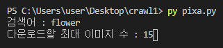 flower을 검색하여 나온 이미지 15개를 얻어올 것이다.