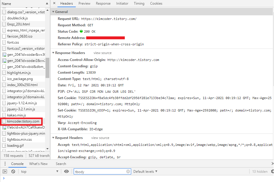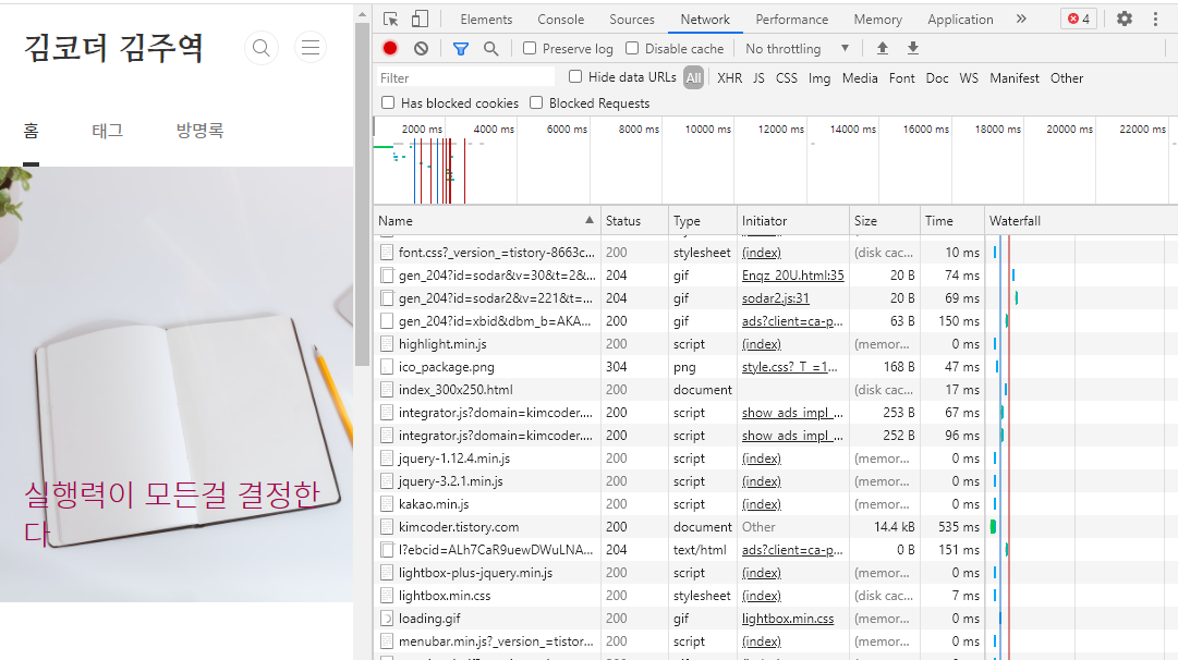 이렇게 Network 탭으로 들어오면 웹 페이지의 파일 목록이 뜨고