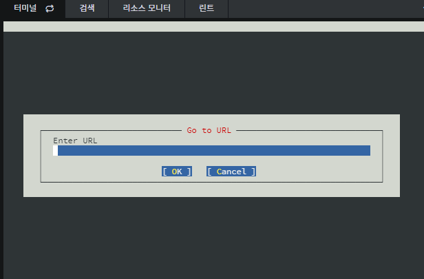 터미널에 "elinks"를 입력하면 다음과 같이 URL을 입력하라는 화면이 나온다.