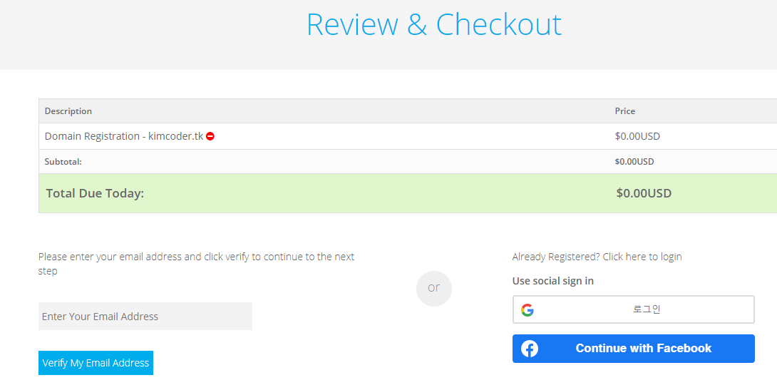 마지막으로 위 구매 내용을 확인하고 이메일 인증을 하거나 소셜 로그인을 진행하고, 그 후 표시되는 화면에서 국가까지선택하면 도메인 발급이 완료된다.