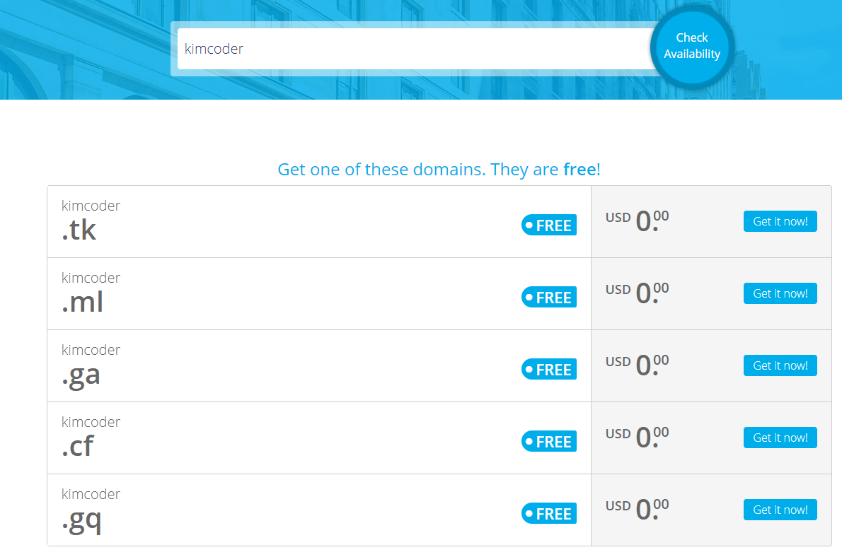 아래 5개의 무료 도메인 종류는 아무도 사용중이지 않으며 무료로 이용할 수 있음을 확인했다.