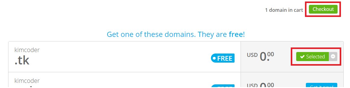 여러분은 각자의 도메인 검색 목록에서 원하는 도메인을 골라 등록하기를 누르면 된다.