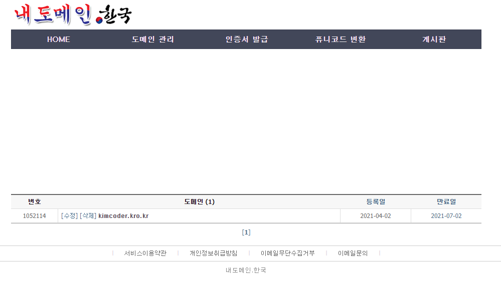 필자는 이미 kimcoder.kro.kr라는 도메인을 발급 받았기 때문에 등록 불가가 나온 것이다.