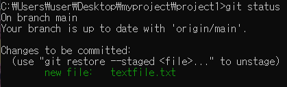 이제 프로젝트에 변화를 일으켜 원격 저장소(깃허브)에 이 변화를 반영시켜보자. textfile이라는 빈 .txt파일을 생성했다.