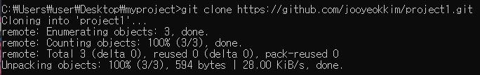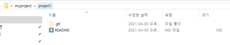 myproject 폴더 안에 project1 프로젝트를 성공적으로 불러왔다. README 파일은 필자가 저장소 생성시 체크해서 자동 생성된 것이다.
