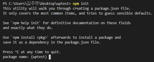 명령을 입력했다면 package name부터 시작해서 package의 특성을 줄 수 있는데, 모두 기본값으로 지정하고 싶다면 계속 엔터를 눌러 스킵하면 된다.