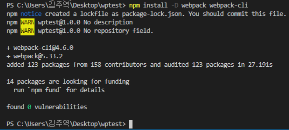 그리고 다음 명령어로 webpack, webpack-cli를 설치한다.