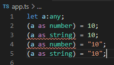 a가 특정 타입으로 단언된 후에, 다른 타입의 값을 대입하니 오류가 나는 모습을 확인할 수 있다.