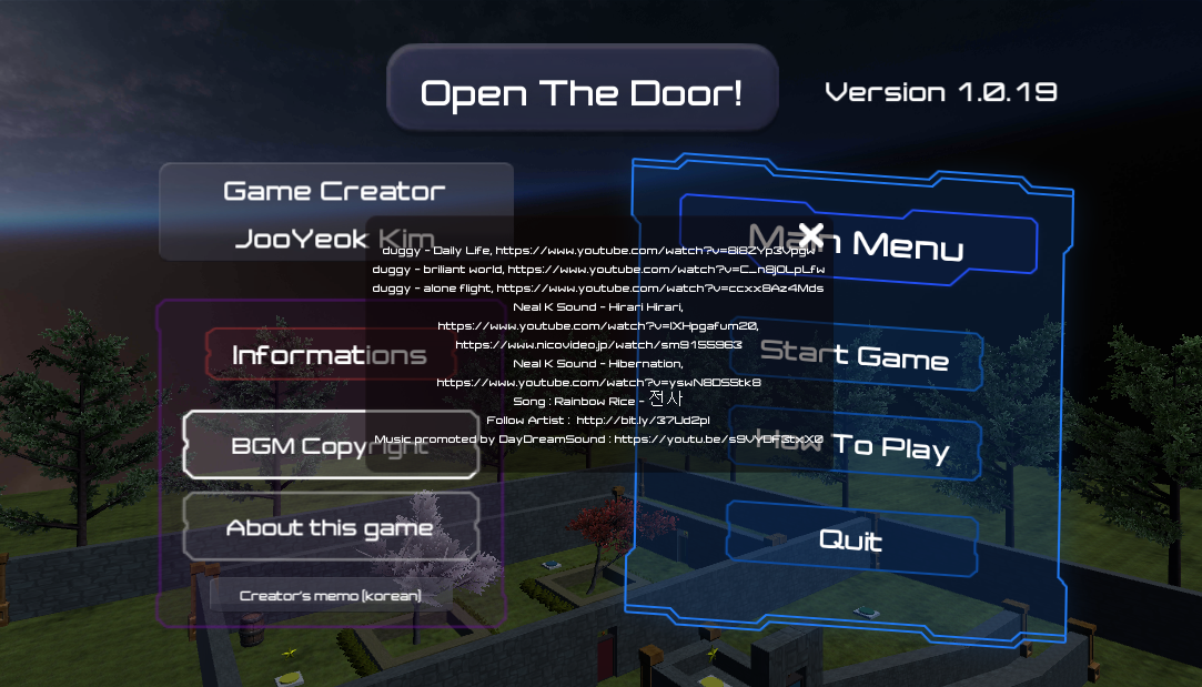 - 메인화면에 있는 BGM Copyright, About this game, Creater's memo UI 활성화 - 설명 추가
