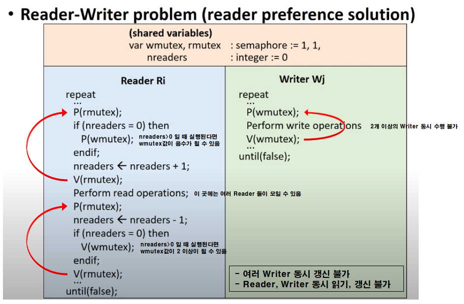 - 초기화, P(), V() 연산으로만 접근 가능 : 한 번에 수행되는 것이 보장됨