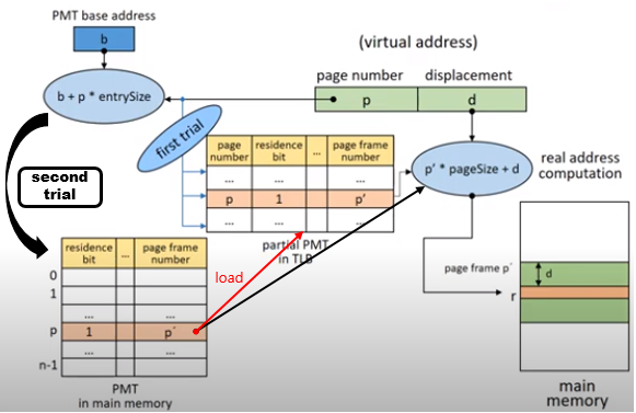 TLB에 적재되어 있지 않은 경우에는 Direct mapping으로 page frame번호를 확인하고 해당 PMT entry를 TLB에 적재한다.