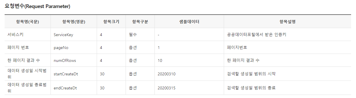 주의할 점이 있다면, 요청 파라미터에 serviceKey가 없다고 해서 serviceKey를 생략하면 안된다.
